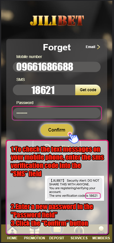 1.To check the text messages on your mobile phone, enter the sms verification code into the “SMS” field